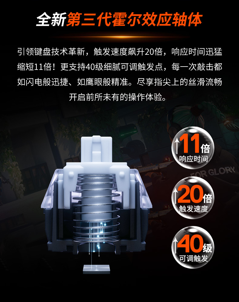 ●全新第三代霍尔效应轴体:引领键盘技术革新,支持40级细腻可调触发点、触发速度飙升20倍、响应时间更是缩短了11倍。