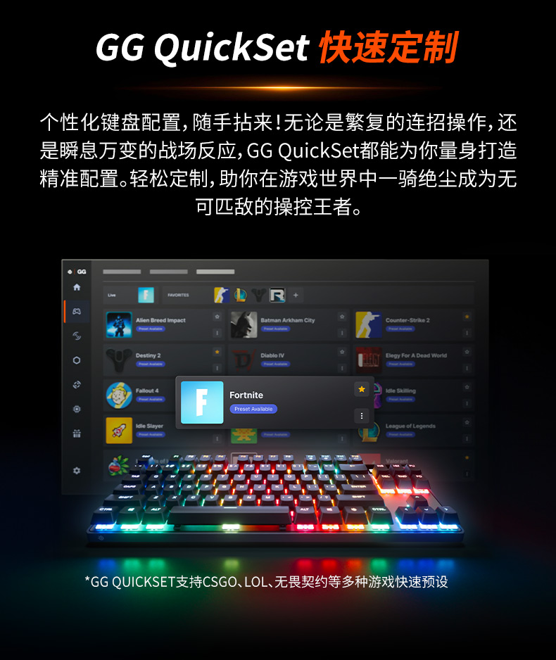 ●赛睿独家GG QuickSet快速定制:个性化键盘配置,能为你量身打造精准的游戏配置,一键调节游戏预设。
