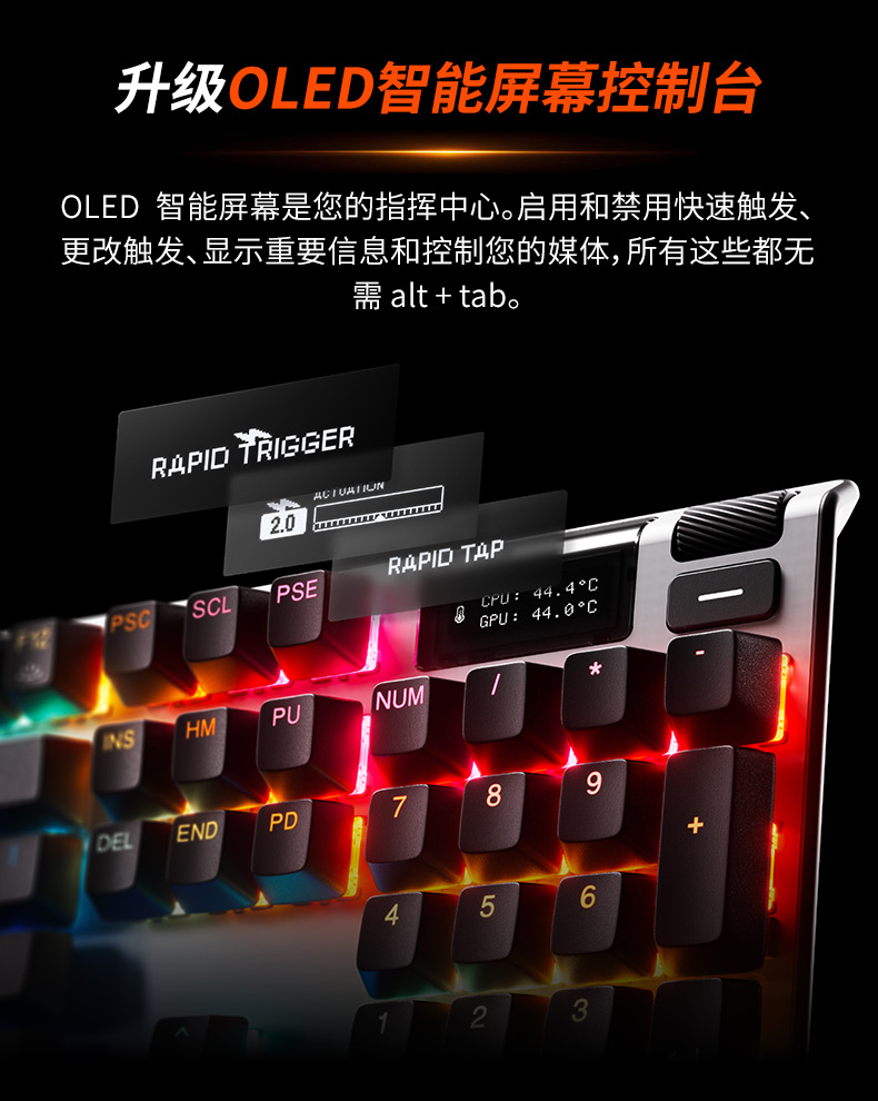 升级OLED智能屏幕控制台,一键调整RT功能和游戏设置,支持自定义文字或图案,使键盘更加个性化。同时,该屏幕还能实时显示键盘当前的功能状态,让玩家一目了然。