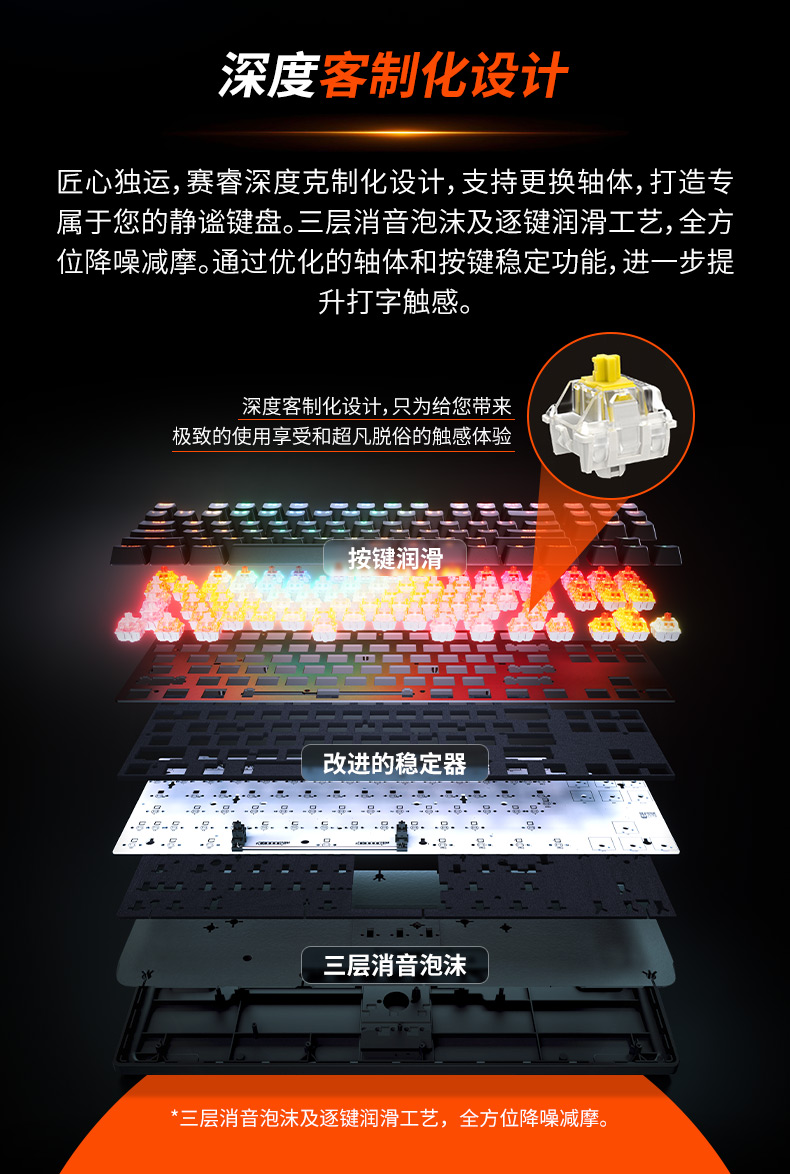 ●深度客制化设计:三层消音泡沫、可替换轴体以及逐键润滑工艺、全方位降噪减摩。打造专属于你的静谧键盘,按键稳定性更胜一筹。深度客制化设计,只为给你带来极致的使用享受和超凡脱俗的触感体验。