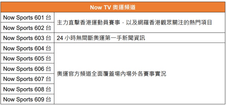 Now Sports 在奥运期间提供九条频道,包括 Now Sports 601 台及 602 台,主力直击香港运动员赛事。Now Sports 603 台将 24 小时无间断为观众带来奥运第一手新闻资讯;加上六条奥运官方频道 Now Sports 604 至 609 台,全面覆盖场内场外各赛事实况。观看奥运节目时,亦可像看欧洲国家杯引入“一齐睇”功能。于奥运频道中,观众可以透过 Now 随身睇邀请最多三位朋友一齐收看赛事。