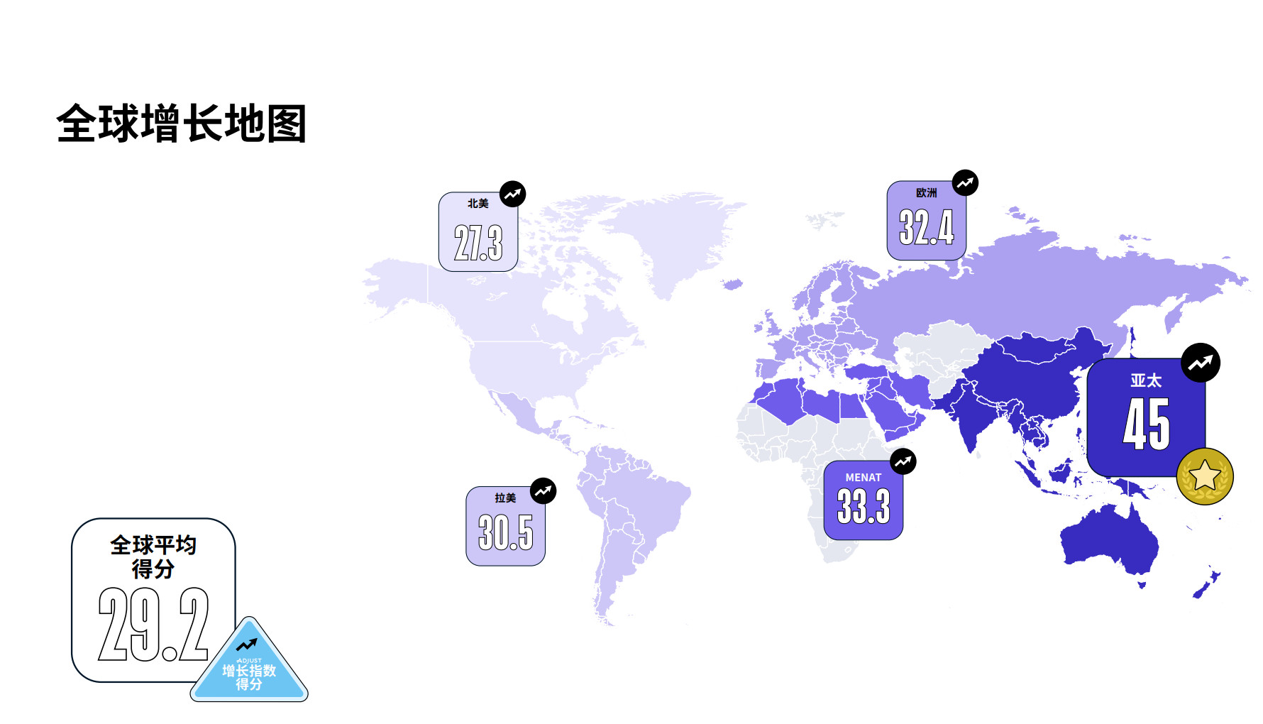 2025年,全球平均增长指数得分为 29.2。以此为统一基准,出海营销人员可以更好地了解各地区、国家、行业以及不同组合维度的表现。Adjust 还同步发布了增长地图,直观呈现各区域得分分布,助力营销人员了解全球增长热点。